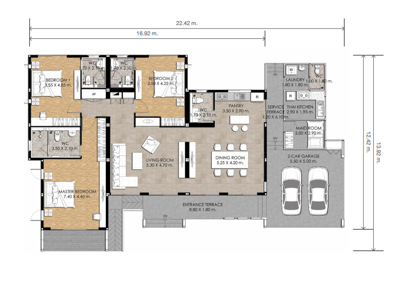 3 ห้องนอน 4 ห้องน�้ำ ห้องรับแขก ห้องพระ ห้องรับประทานอาหาร ห้องเตรียมอาหาร ห้องครัวไทย เรือนแม่บ้าน 1 ห้อง